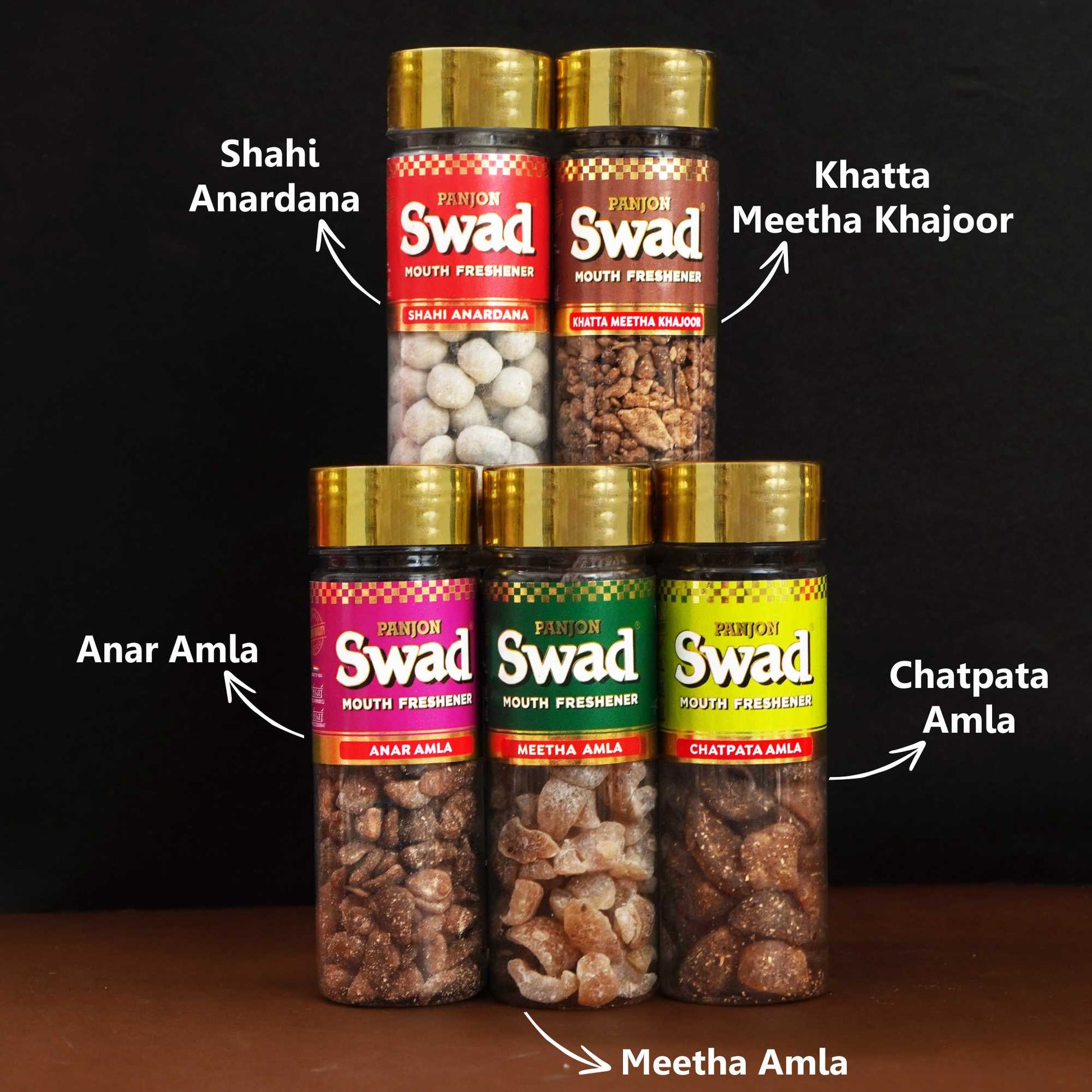 Panjon Swad Mukhwas Anar Amla, Meetha Amla,Chatpata Amla ,Anardana goli, Khatta Meetha Khajoor Mukhwas 5 Bottles, 730g