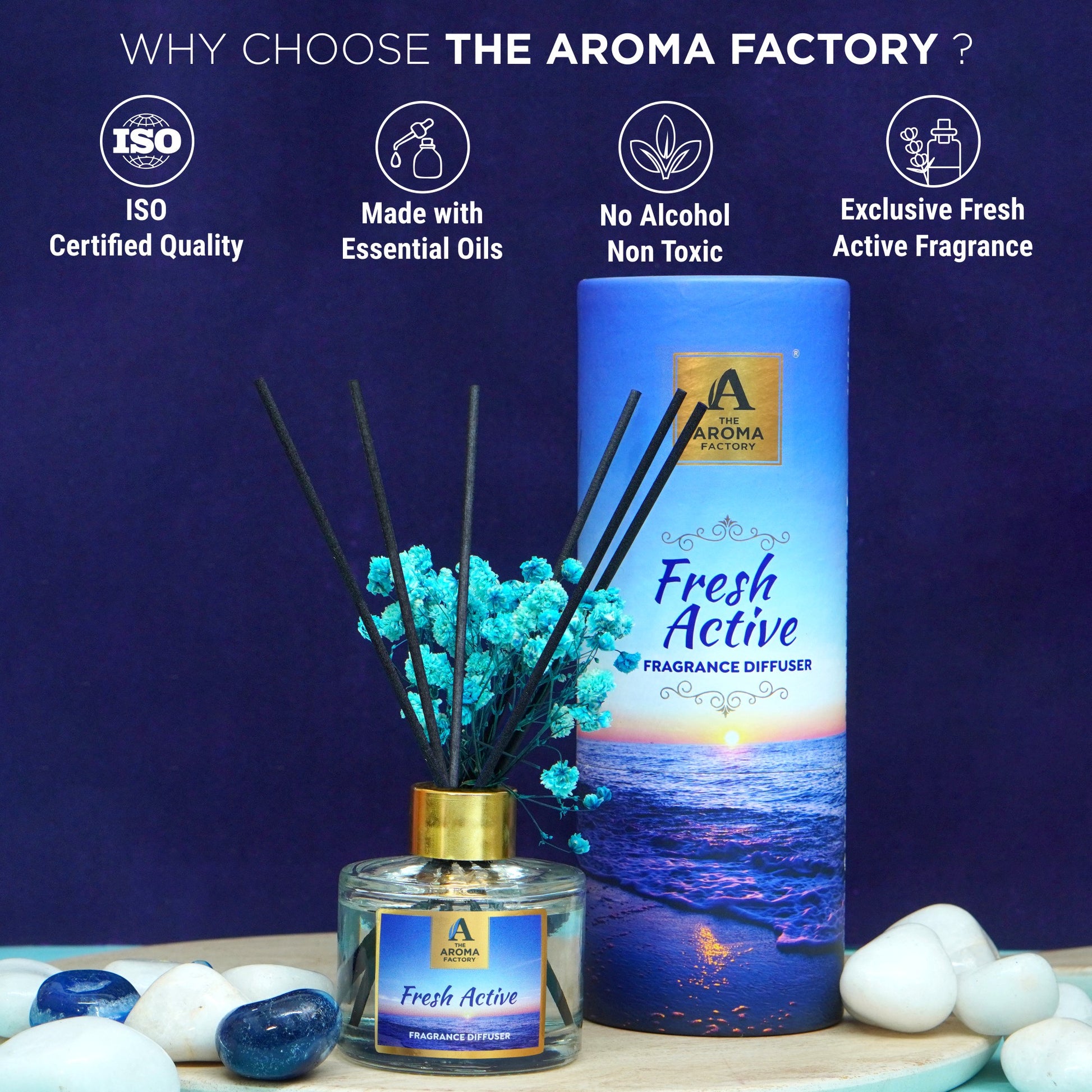 The Aroma Factory Fragrance Diffuser Set with Fibre Reed Sticks, Real Flowers, 100 ml (3.4 Oz) Aroma Oil (Fresh Active, 1 Box) The Aroma Factory Reed Diffusers are perfect gift for friends, family. Fresh Fragrance curated by Scented oil essential Perfumers to add magic aromas to your senses. Made using natural essential oils in alcohol free aromatic fragrance base. celebration with greeeting happy cards. Hamper fibre fiber rattan reeds. Refill & Reuse, they last upto 60 days based on usage/air at home, office, spa. Try Our Range : Rose, Lavender, Lemongrass, Citrus Lemon, Fresh Active, White Sage.