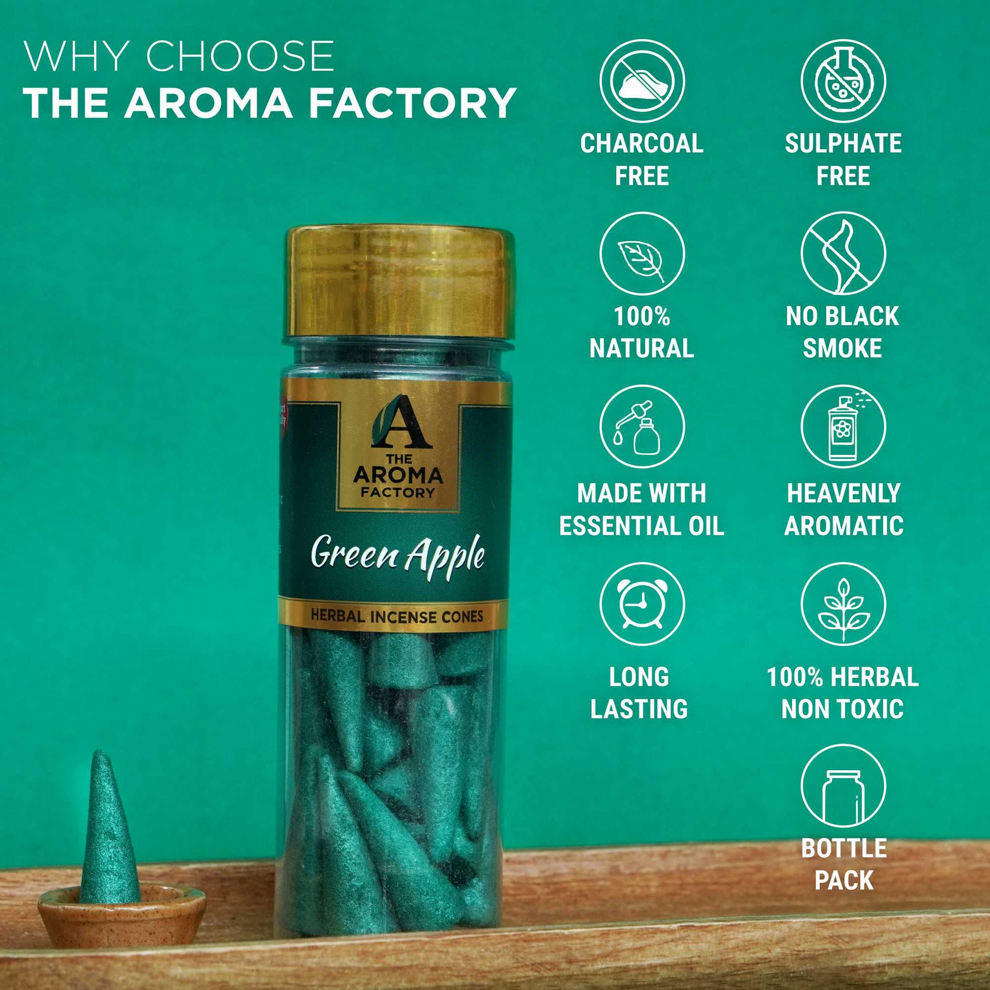 The Aroma Factory Green Apple Incense Cone (0% Charcoal 0% Suphates Herbal Dhoop) Free Holder Bottle Pack, 30 Cones