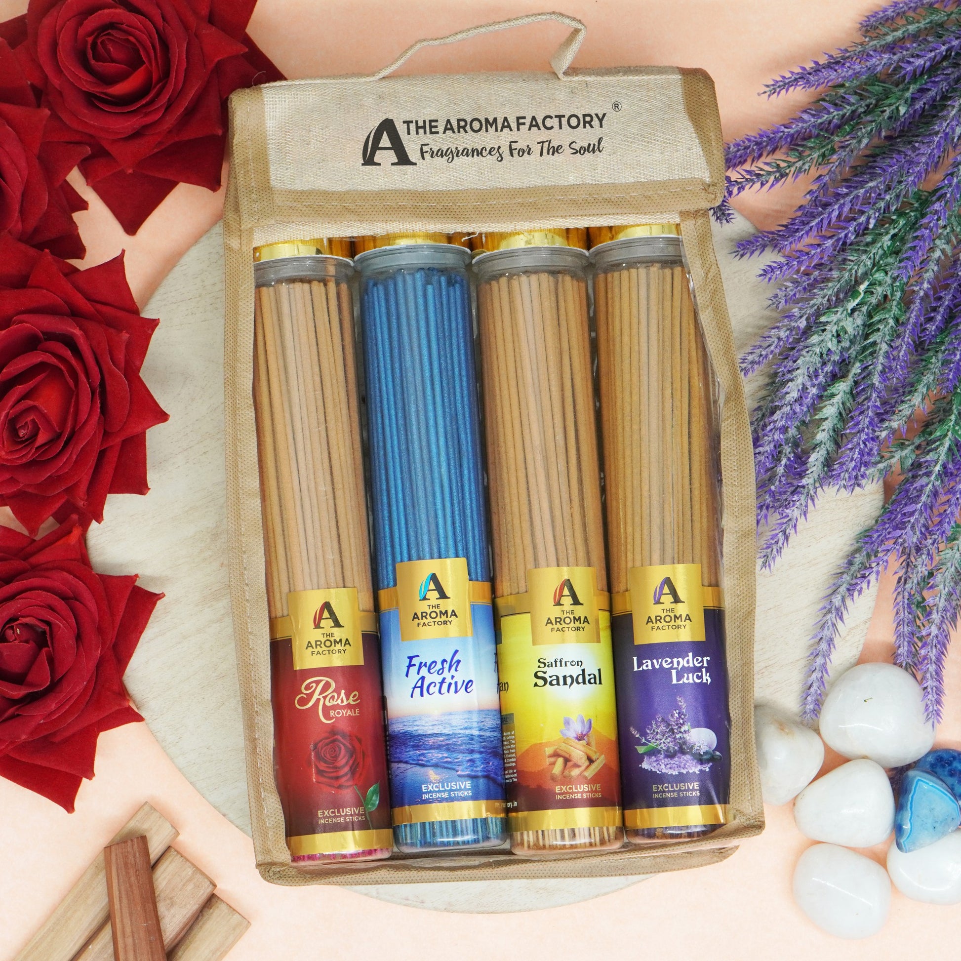 The Aroma Factory Incense Sticks (Saffron Sandal Kesar Chandan, Rose, Fresh Active & Lavender Agarbatti) 4 bottles, Fragrance Jute Gift Pack