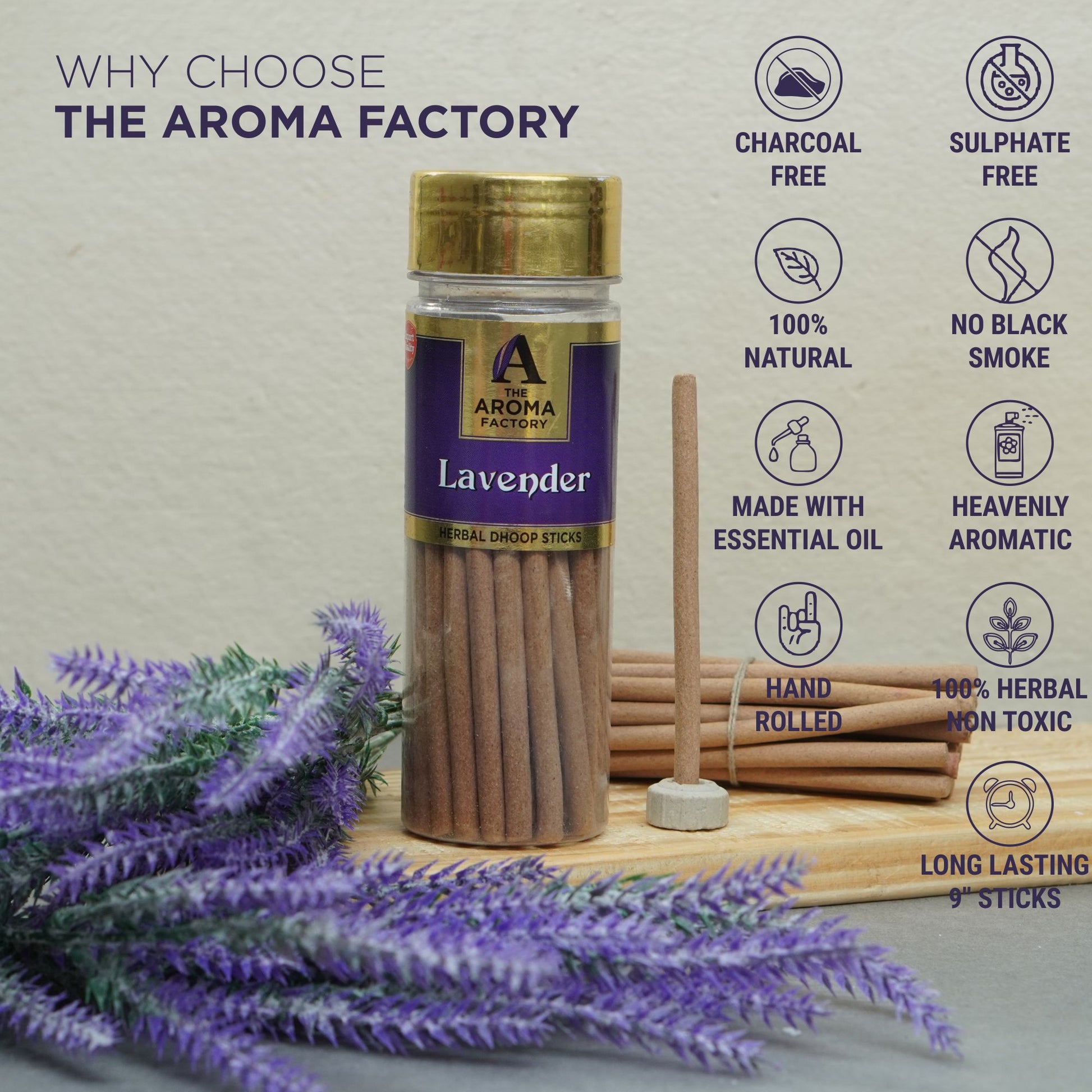 The Aroma Factory Lavender Dhoop Stick (0% Charcoal 0% Suphates) Herbal Incense Dhoopbatti Bottle Pack, 100g