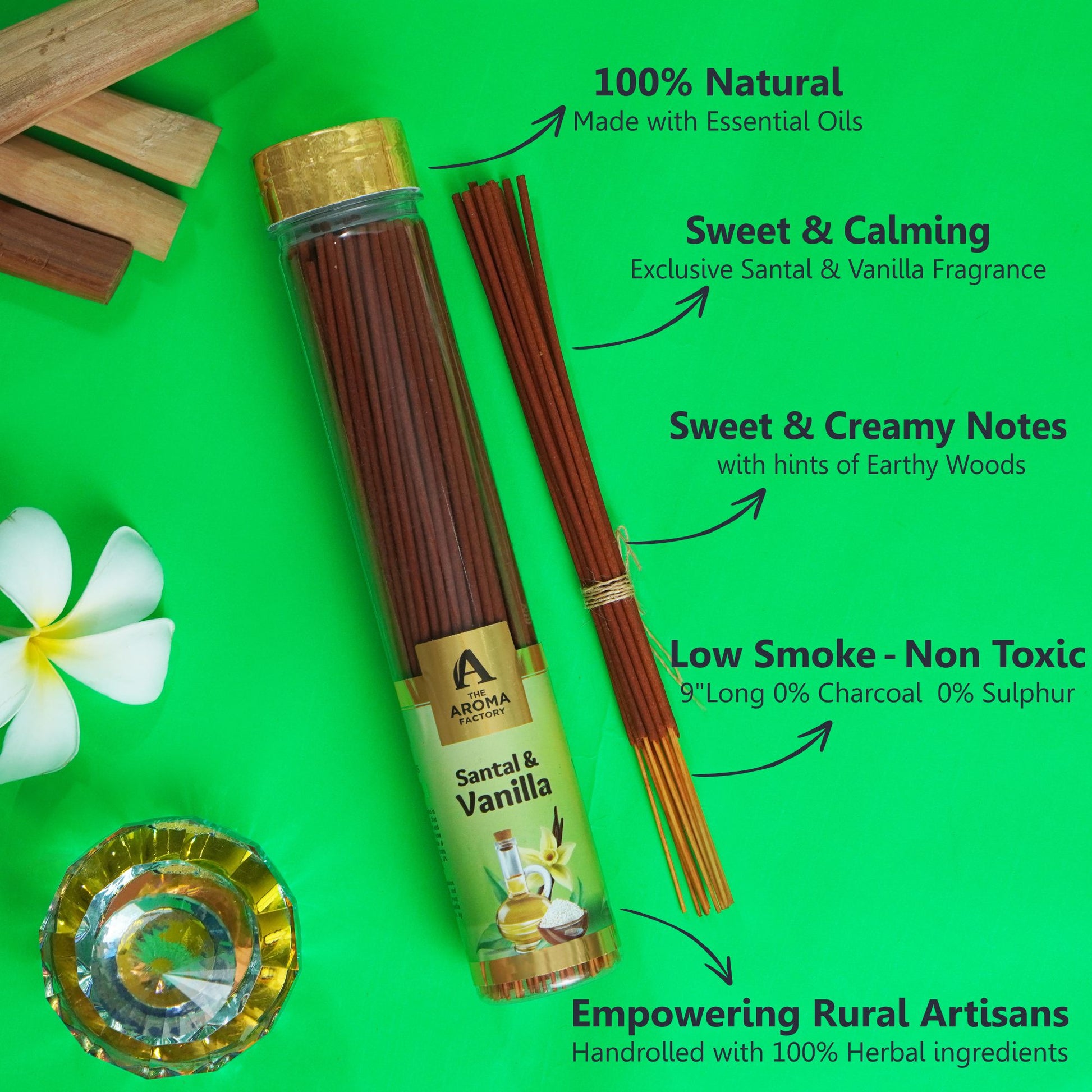 The Aroma Factory Vanilla & Santal Incense Stick (0% Charcoal 0% Sulphates) Organic & Herbal Agarbatti Bottle Pack, 100G