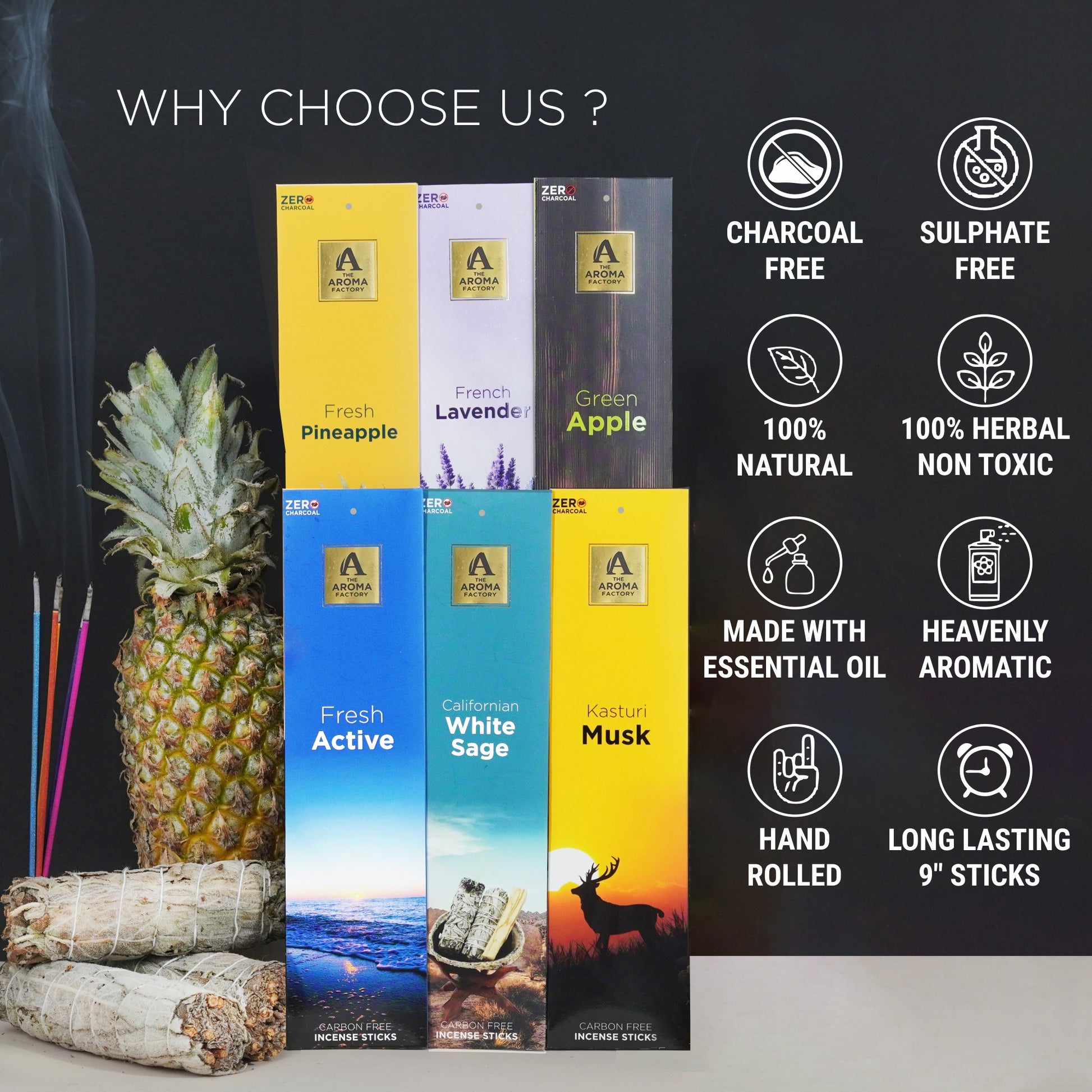 The Aroma Factory Premium Incense Sticks for Pooja | Set of 6 Fragrances Gift Pack (Lavender, Musk, White Sage, Fresh, Apple) 120 Agarbatti (6 x 20 Sticks Each)